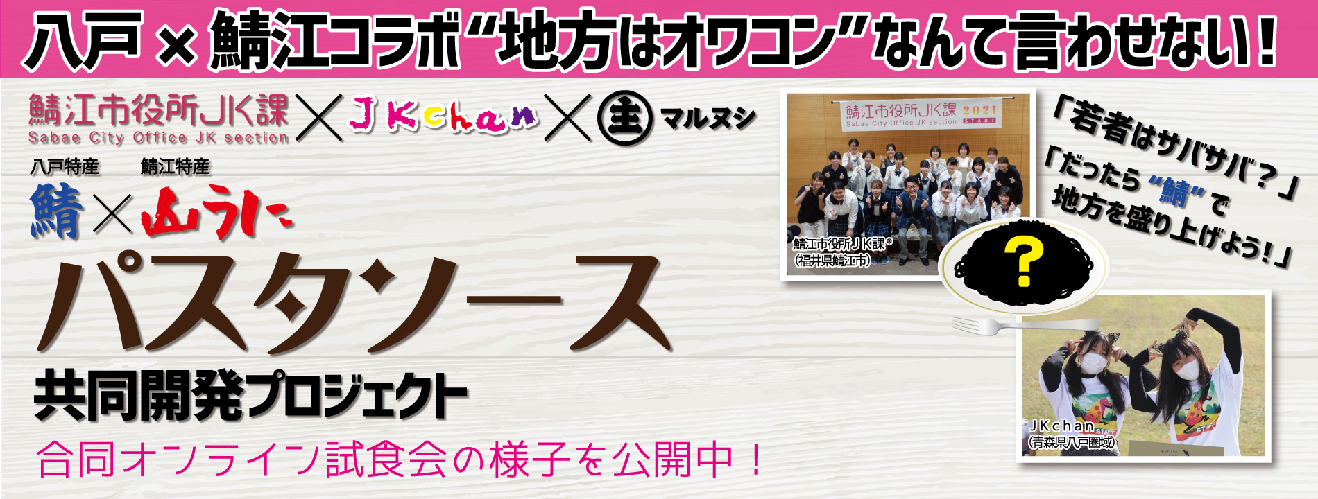 JKchanプロジェクトでは2022年1月から「鯖江市役所JK課®」の皆様と一緒に「地方を“オワコン”だなんて言わせない!」をテーマにした、青森県八戸市の特産食材「鯖」と、福井県鯖江市の特産品「山うに」を使った特製パスタソースの開発プロジェクトに取り組んでいます。